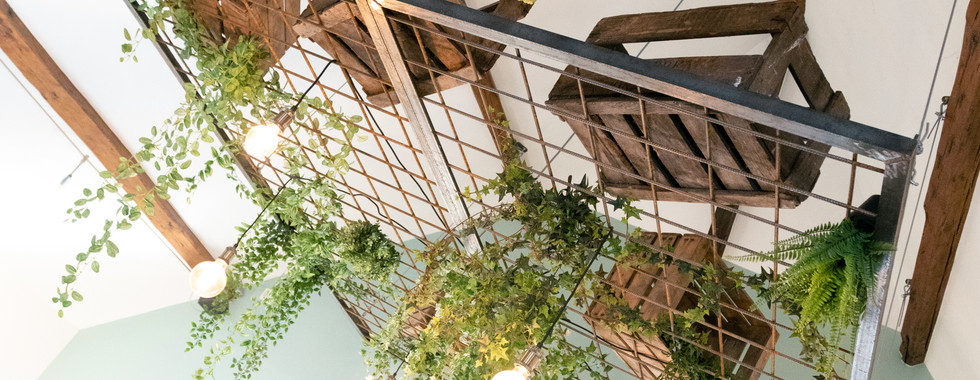 - A l'étage: cadres métalliques suspendus afin de diminuer le volume (pour l'acoustique, pour apporter une touche chaleureuse et pour éclairer davantage). Lorane avait même disposé elle même les plantes à bout de bras! Je dois encore avoir des photos, cela vaut cher!
