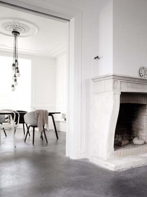 Murs et plafonds sont blancs: les meubles, éclairages et moulures sont mis en évidence.
